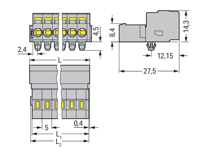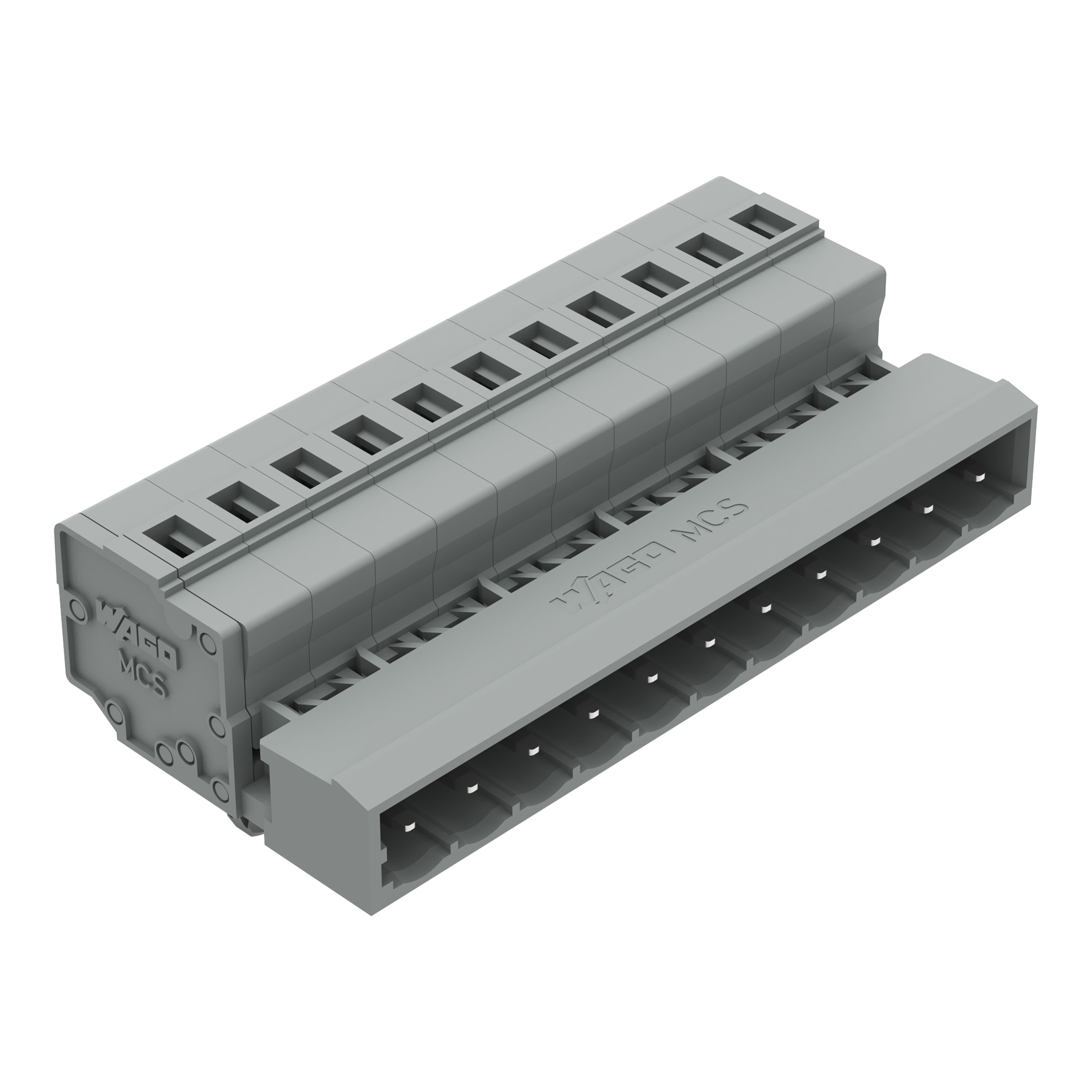 Connettore maschio per 1 conduttore. CAGE CLAMP®. 2,5 mm2. Passo pin 5 mm. 11 poli. Montaggio su guida DIN 35/pannello. Piedi di fissaggio a scatto. 2,50 mm2. grigio