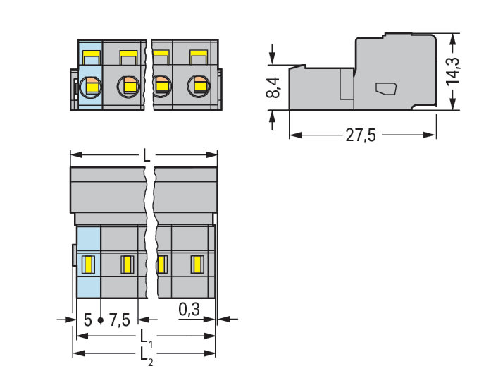 Connettore maschio per 1 conduttore. CAGE CLAMP®. 2,5 mm2. Passo pin 7,5 mm. 7 poli. 2,50 mm2. grigio