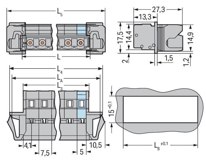 Connettore maschio per 1 conduttore. CAGE CLAMP®. 2,5 mm2. Passo pin 7,5 mm. 7 poli. Flangia a scatto. 2,50 mm2. grigio