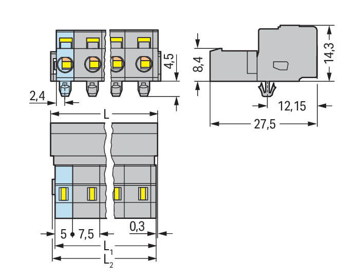 Connettore maschio per 1 conduttore. CAGE CLAMP®. 2,5 mm2. Passo pin 7,5 mm. 13 poli. Montaggio su guida DIN 35/pannello. Piedi di fissaggio a scatto. 2,50 mm2. grigio