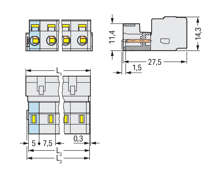 Connettore maschio per 1 conduttore. CAGE CLAMP®. 2,5 mm2. Passo pin 7,5 mm. 2 poli. Protetto al 100% contro l'inversione di polarità. Piastrina antistrappo. 2,50 mm2. grigio chiaro