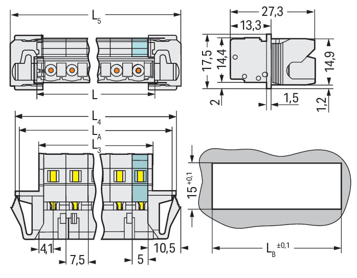Connettore maschio per 1 conduttore. CAGE CLAMP®. 2,5 mm2. Passo pin 7,5 mm. 4 poli. Protetto al 100% contro l'inversione di polarità. Flangia a scatto. 2,50 mm2. grigio chiaro