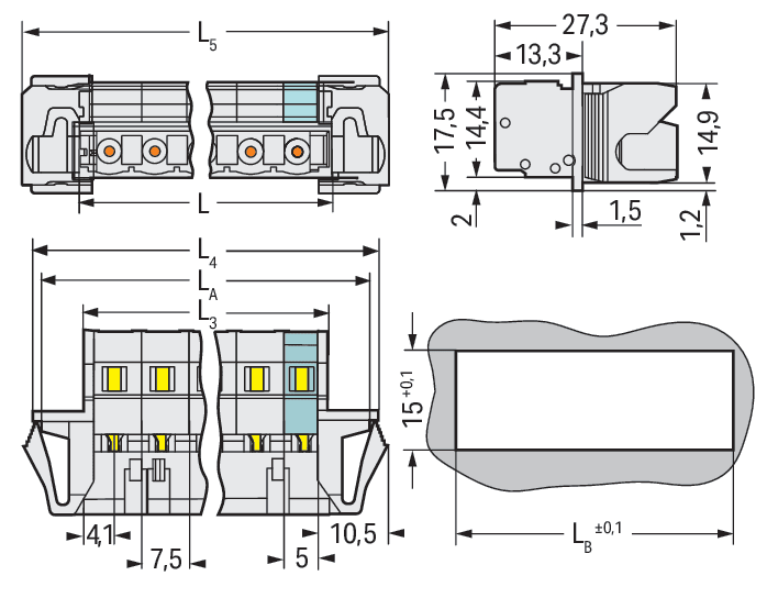Connettore maschio per 1 conduttore. CAGE CLAMP®. 2,5 mm2. Passo pin 7,5 mm. 9 poli. Protetto al 100% contro l'inversione di polarità. Flangia a scatto. 2,50 mm2. grigio chiaro