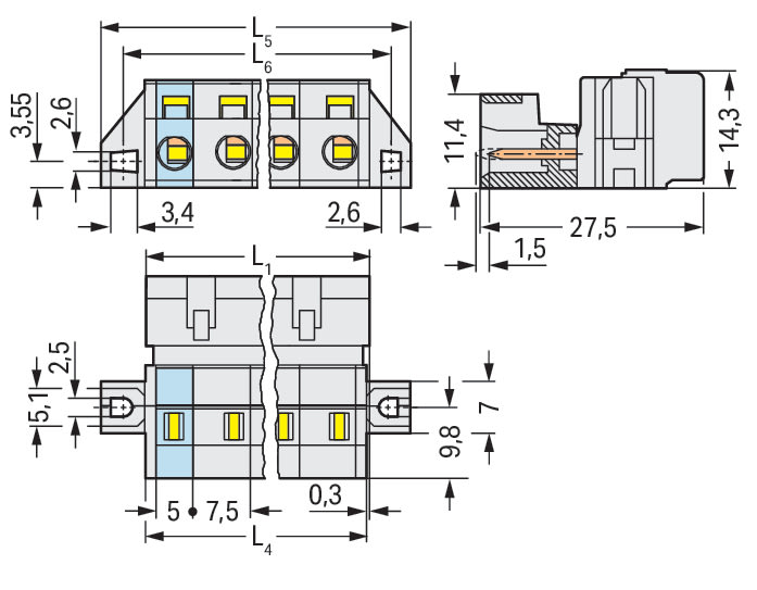 Connettore maschio per 1 conduttore. CAGE CLAMP®. 2,5 mm2. Passo pin 7,5 mm. 11 poli. Protetto al 100% contro l'inversione di polarità. collare di fissaggio. 2,50 mm2. grigio chiaro