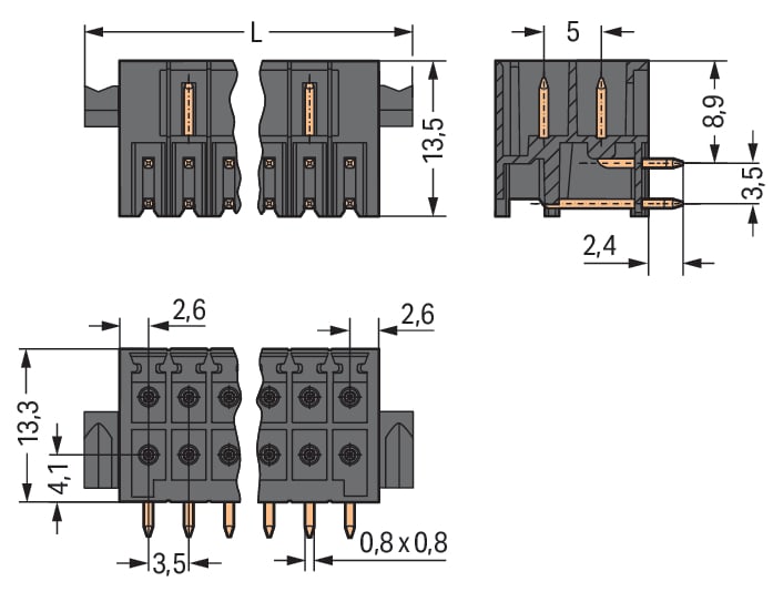 Connettore maschio THR, 2 file. Pin a saldare 0,8 x 0,8 mm. angolato. Protetto al 100% contro l'inversione di polarità. Leve. Passo pin 3,5 mm. 36 poli. nero