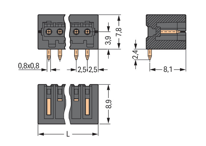 WAGO ELETTRONICA - Connettore maschio THR.Pin a saldare 0,8 x 0,8 mm.angolato.nero 733-369/105-604