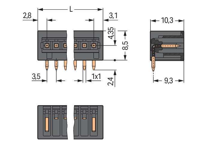 Connettore maschio THR. Pin a saldare 1,0 x 1,0 mm. angolato. Protetto al 100% contro l'inversione di polarità. Passo pin 3,5 mm. 11 poli. nero