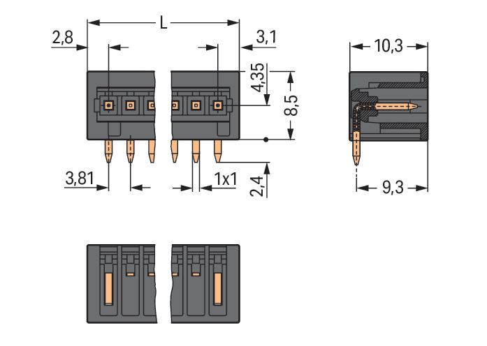 Connettore maschio THR. Pin a saldare 1,0 x 1,0 mm. angolato. Protetto al 100% contro l'inversione di polarità. Passo pin 3,81 mm. 4 poli. nero