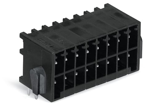 Connettore maschio THT, 2 file. Pin a saldare 0,8 x 0,8 mm. angolato. Protetto al 100% contro l'inversione di polarità. Leve. Passo pin 3,5 mm. 12 poli. nero