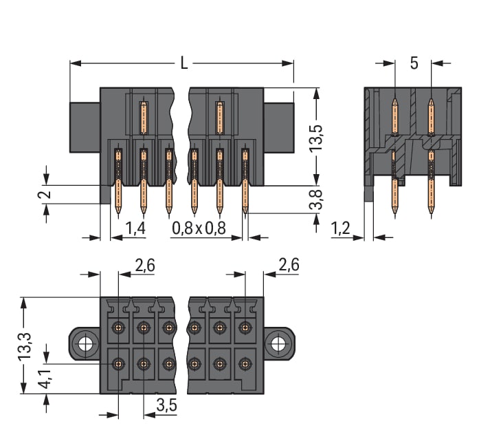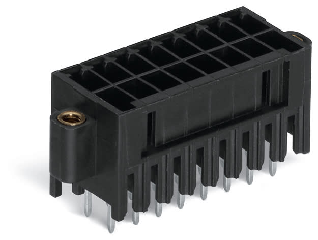 Connettore maschio THT, 2 file. Pin a saldare 0,8 x 0,8 mm. dritto. Protetto al 100% contro l'inversione di polarità. con perno di orientamento. Flangia filettata. Passo pin 3,5 mm. 16 poli. nero