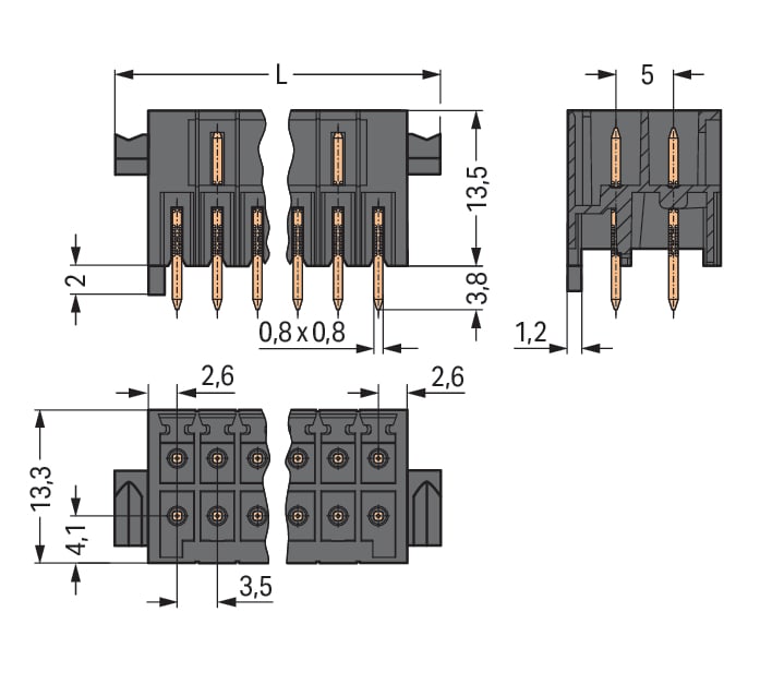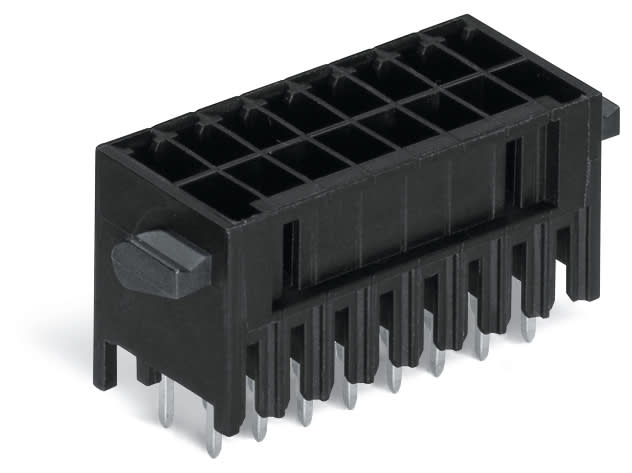 Connettore maschio THT, 2 file. Pin a saldare 0,8 x 0,8 mm. dritto. Protetto al 100% contro l'inversione di polarità. con perno di orientamento. Leve. Passo pin 3,5 mm. 18 poli. nero