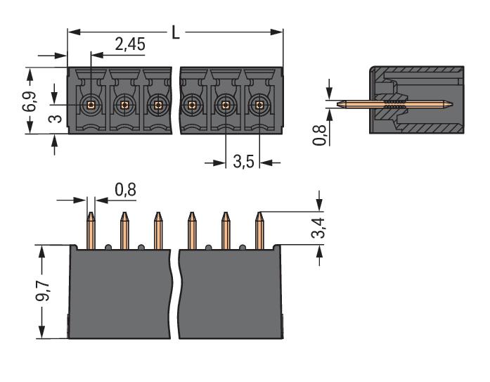 Connettore maschio THT. Pin a saldare 0,8 x 0,8 mm. dritto. Passo pin 3,5 mm. 3 poli. nero
