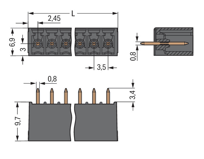 Connettore maschio THT. Pin a saldare 0,8 x 0,8 mm. dritto. Passo pin 3,5 mm. 4 poli. nero