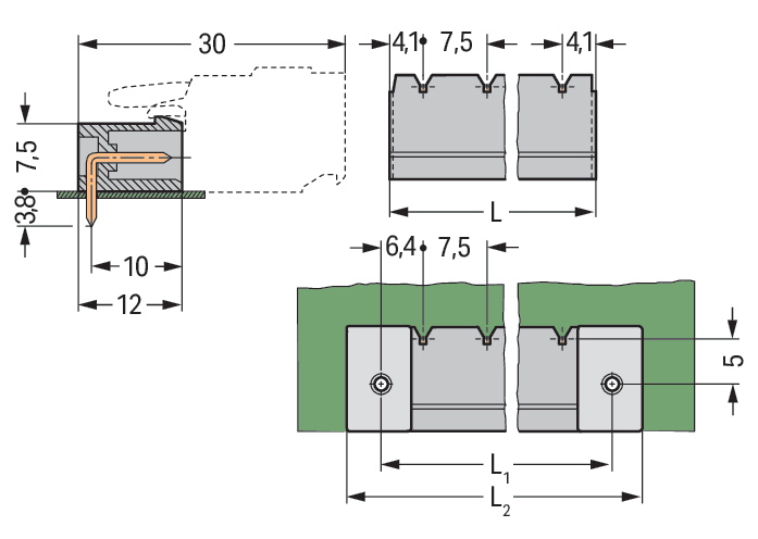 Connettore maschio THT. Pin a saldare 1,0 x 1,0 mm. angolato. Passo pin 7,5 mm. 7 poli. grigio