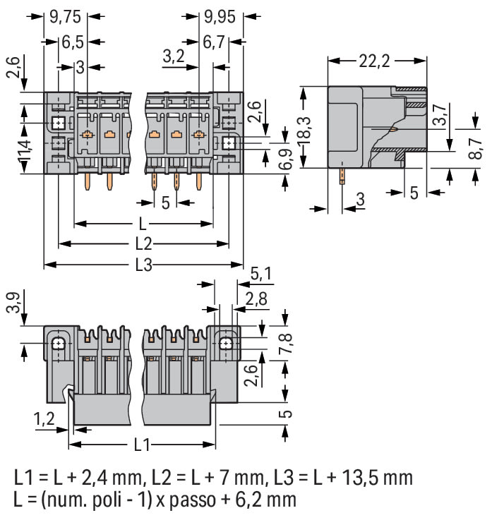 Connettore maschio THT. Pin a saldare 1,0 x 1,0 mm. angolato. Flangia passante. Passo pin 5 mm. 11 poli. grigio