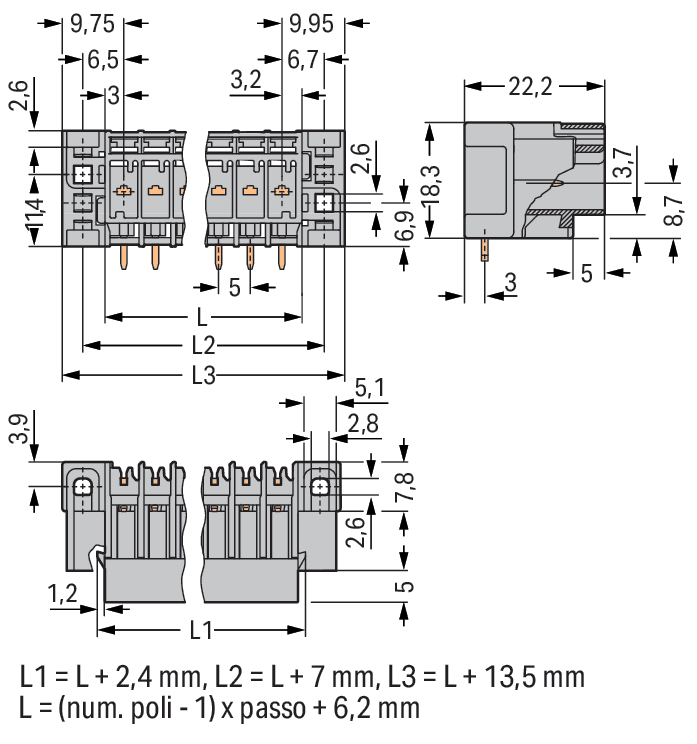 Connettore maschio THT. Pin a saldare 1,0 x 1,0 mm. angolato. Flangia passante. Passo pin 5 mm. 12 poli. grigio