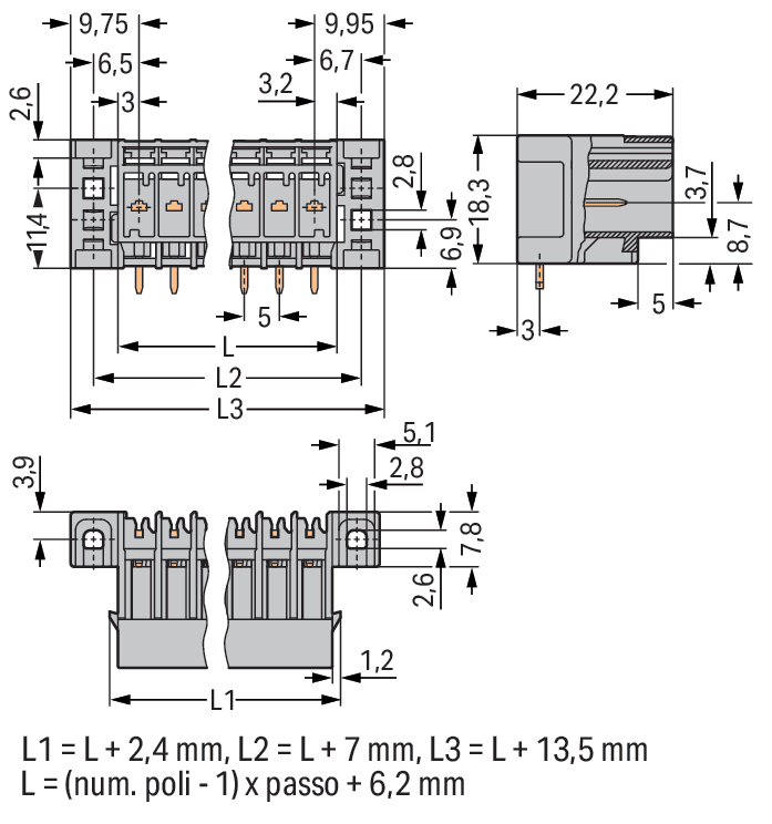WAGO ELETTRONICA - Connettore maschio THT.Pin a saldare 1,0 x 1,0 mm.angolato.grigio 769-674/003-000