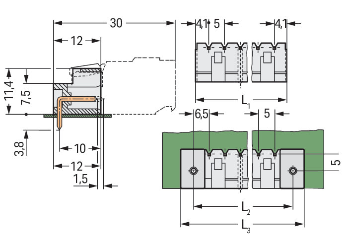 WAGO ELETTRONICA - Connettore maschio THT.Pin a saldare 1,0 x 1,0 mm.angolato.grigio chiaro 721-438/001-000