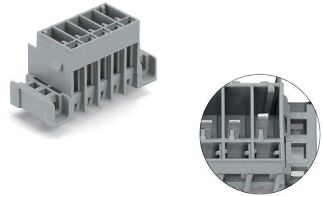Connettore maschio THT. Pin a saldare 1,0 x 1,0 mm. dritto. Contatto di terra avanzato. collare di fissaggio. Passo pin 5 mm. 6 poli. giallo-verde, grigio