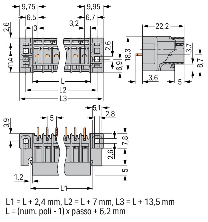 Connettore maschio THT. Pin a saldare 1,0 x 1,0 mm. dritto. Flangia passante. Passo pin 5 mm. 15 poli. grigio