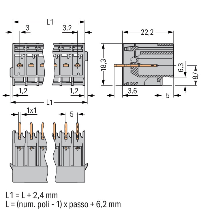 Connettore maschio THT. Pin a saldare 1,0 x 1,0 mm. dritto. Passo pin 5 mm. 6 poli. grigio
