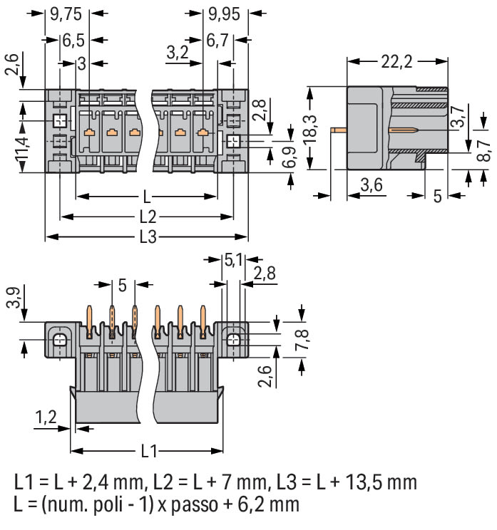 WAGO ELETTRONICA - Connettore maschio THT.Pin a saldare 1,0 x 1,0 mm.dritto.grigio 769-637/003-000