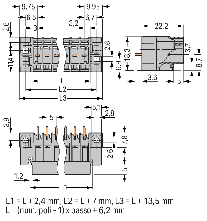 Connettore maschio THT. Pin a saldare 1,0 x 1,0 mm. dritto. Flangia passante. Passo pin 5 mm. 11 poli. grigio