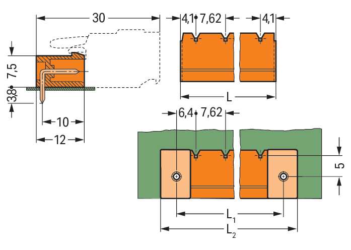 Connettore maschio THT. Pin a saldare 1,2 x 1,2 mm. angolato. Passo pin 7,62 mm. 12 poli. arancione