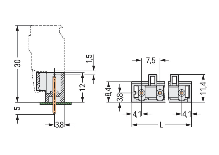 WAGO ELETTRONICA - Connettore maschio THT.Pin a saldare 1,2 x 1,2 mm.dritto.grigio chiaro 721-263/001-000
