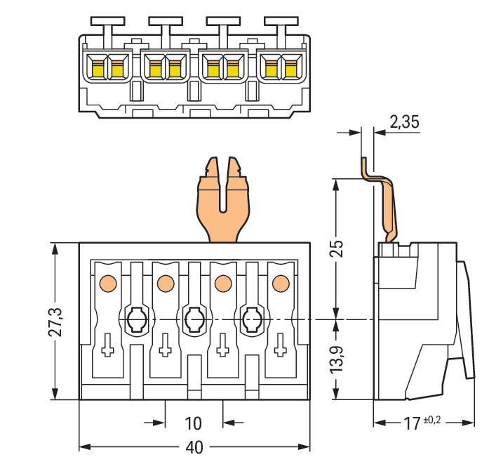 Connettore per illuminazione. pulsante, esterno. con contatto di terra a scatto angolato. 1/L´-2/L-PE-N. 4 poli. Lato lampada: per conduttori rigidi. Lato installazione: per tutti i tipi di conduttore. max. 2,5 mm2. Temperatura ambiente: max. 85 °C (T85). 2,50 mm2. bianco