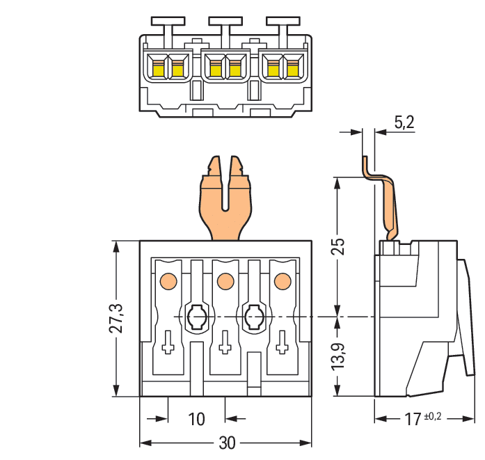 Connettore per illuminazione. pulsante, esterno. con contatto di terra a scatto angolato. N-PE-L. 3 poli. Lato lampada: per conduttori rigidi. Lato installazione: per tutti i tipi di conduttore. max. 2,5 mm2. Temperatura ambiente: max. 85 °C (T85). 2,50 mm2. bianco