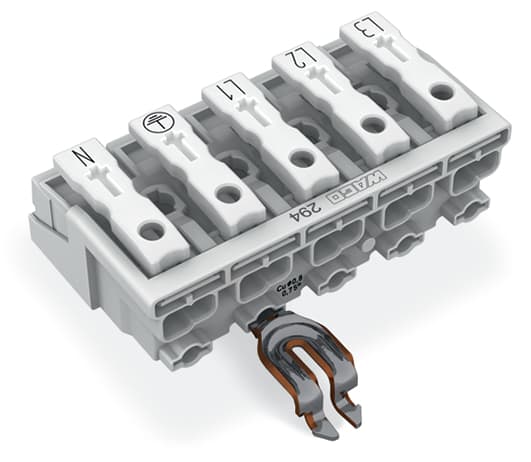 Connettore per illuminazione. pulsante, esterno. con contatto di terra a scatto angolato. L3-L2-L1-PE-N. 5 poli. Lato lampada: per conduttori rigidi. Lato installazione: per tutti i tipi di conduttore. max. 2,5 mm2. Temperatura ambiente: max. 85 °C (T85). 2,50 mm2. bianco