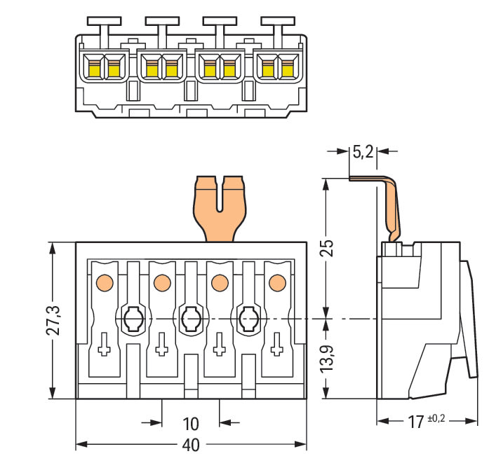 Connettore per illuminazione. pulsante, esterno. con contatto di terra a scatto. 4 poli. Lato lampada: per conduttori rigidi. Lato installazione: per tutti i tipi di conduttore. max. 2,5 mm2. Temperatura ambiente: max. 85 °C (T85). 2,50 mm2. bianco