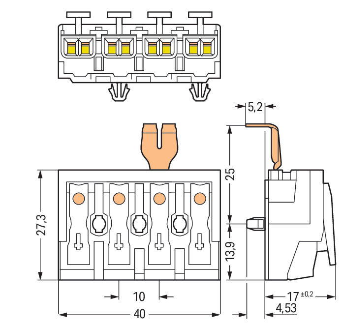 Connettore per illuminazione. pulsante, esterno. con contatto di terra a scatto. 1/L´-2/L-PE-N. 4 poli. Lato lampada: per conduttori rigidi. Lato installazione: per tutti i tipi di conduttore. max. 2,5 mm2. Temperatura ambiente: max. 85 °C (T85). 2,50 mm2. bianco
