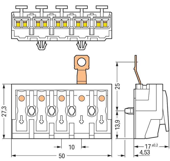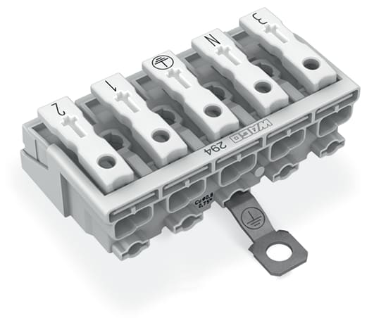Connettore per illuminazione. pulsante, esterno. con contatto di terra a vite. 5 poli. Lato lampada: per conduttori rigidi. Lato installazione: per tutti i tipi di conduttore. max. 2,5 mm2. Temperatura ambiente: max. 85 °C (T85). 2,50 mm2. bianco