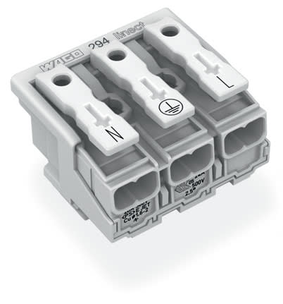 Connettore per illuminazione. pulsante, esterno. per Linect®. senza contatto di terra. 3 poli. Cod. A. Lato lampada: per conduttori rigidi. Lato installazione: per tutti i tipi di conduttore. max. 2,5 mm2. Temperatura ambiente: max. 85 °C (T85). 2,50 mm2. bianco