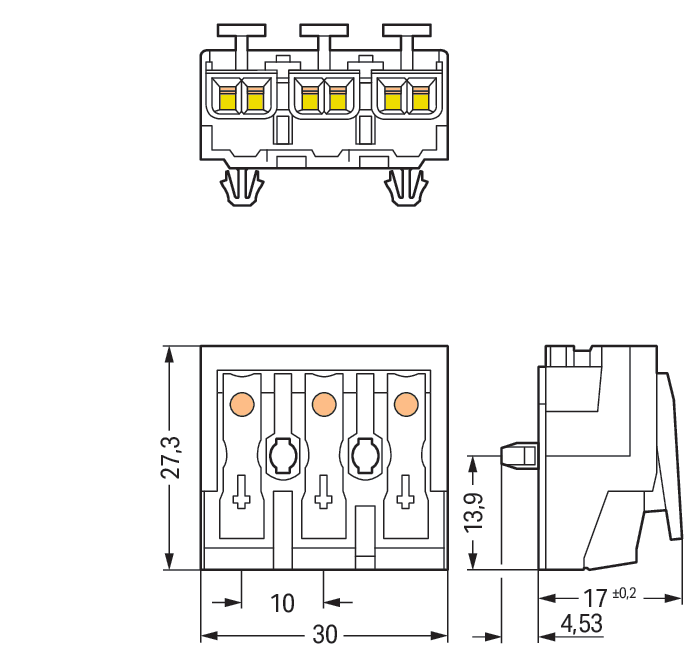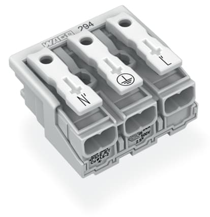 Connettore per illuminazione. pulsante, esterno. senza contatto di terra. 3 poli. Lato lampada: per conduttori rigidi. Lato installazione: per tutti i tipi di conduttore. max. 2,5 mm2. Temperatura ambiente: max. 85 °C (T85). 2,50 mm2. bianco