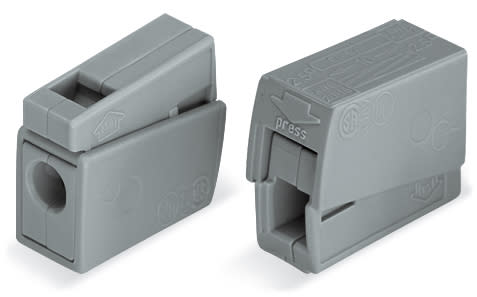 Connettore per illuminazione. pulsante lato lampada. Lato lampada: per tutti i tipi di conduttore. Lato installazione: per conduttori rigidi. Serie 224. max. 2,5 mm2. temperatura operativa ambiente max 60 °C. 2,50 mm2. grigio