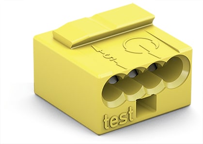 MICRO PUSH WIRE® connector for junction boxes. for solid conductors. max. 0.8 mm Ø. 4-conductor. light gray cover. Surrounding air temperature: max 60°C. yellow