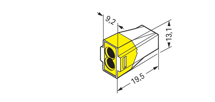 Connettori per scatole di derivazione PUSH WIRE®. per conduttori rigidi e semi-rigidi. max. 2,5 mm2. 2 conduttori. scatola trasparente. copertura gialla. temperatura operativa ambiente max 60 °C. 2,50 mm2. multicolore