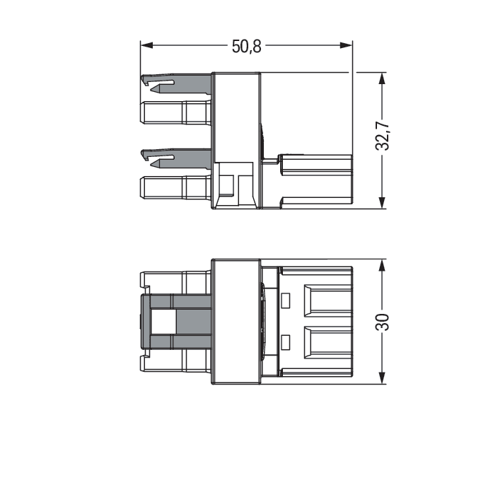 Distributore tipo h. 3 poli. Cod. A. 1 ingresso. 2 uscite. uscite su un lato. 2 leve di bloccaggio. bianco