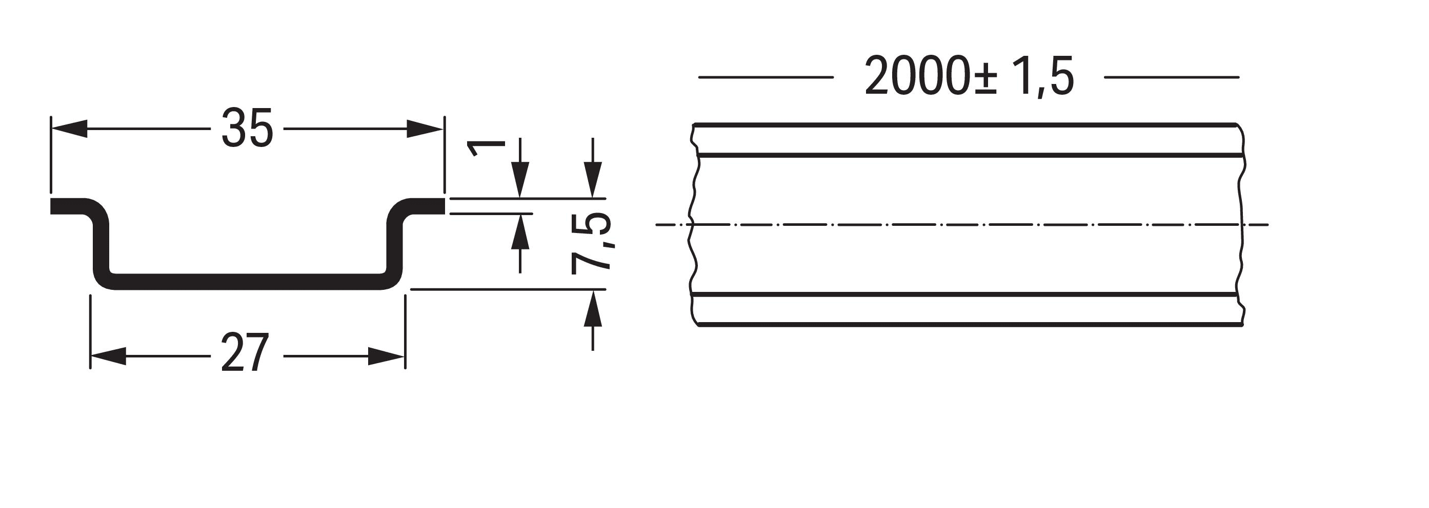 Guida di supporto in acciaio. 35 x 7,5 mm. spessore 1 mm. lunghezza 2 m. senza foratura. galvanizzato. secondo EN 60715. argento-colorato