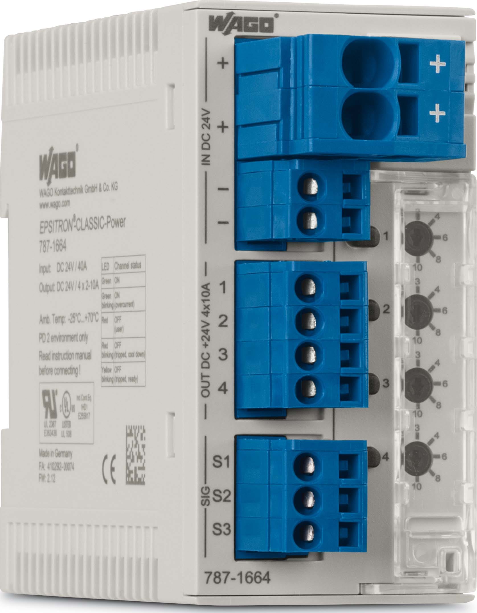 Interruttore di sicurezza elettronico. 4 canali. Tensione di ingresso 24 V DC. regolabile da 1 a 6 A. possibilità di comunicazione