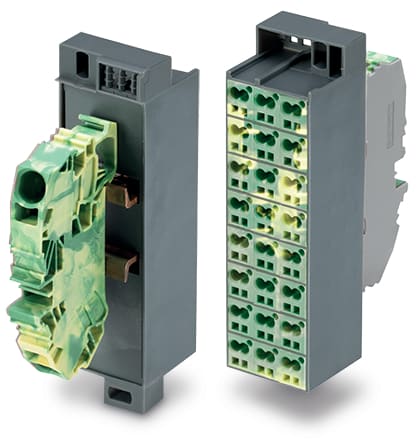 Matrici di ripartizione equipotenziale. Marcatura 1-24. con 1 modulo d'ingresso compr. piastra terminale. Colore dei moduli: giallo-verde. Numerazione dei moduli sistemata verticalmente. per telai da 19''. Versione slimline. 16,00 mm2. grigio scuro