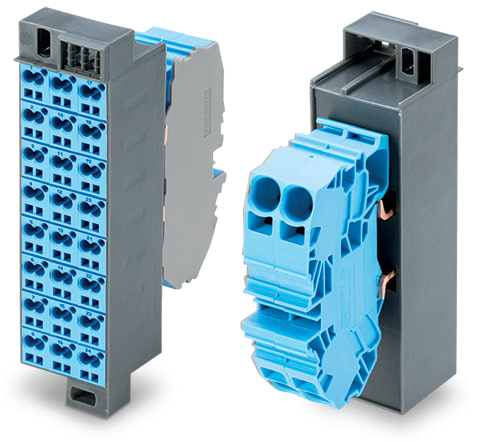 Matrici di ripartizione equipotenziale. Marcatura 1-24. con 2 moduli d'ingresso compr. piastra terminale. Colore dei moduli: blu. Numerazione dei moduli sistemata verticalmente. per telai da 19''. Versione slimline. 2,50 mm2. grigio scuro