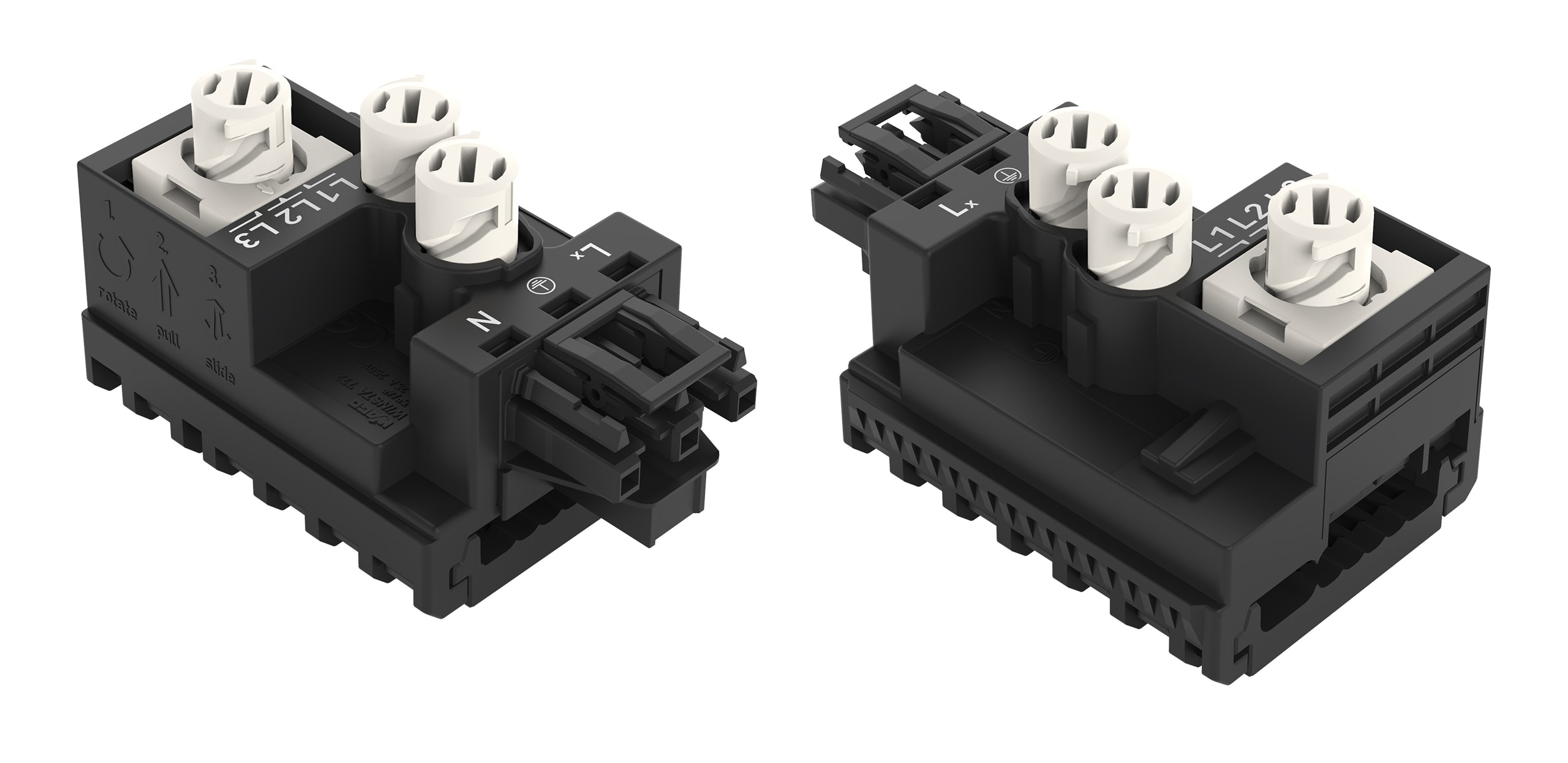 Modulo connessione secondaria. per cavo piatto. 5 x 2,5 mm2 + 2 x 1,5 mm2. 3 poli. Cod. A. con connessione cavo sul lato uscita. nero