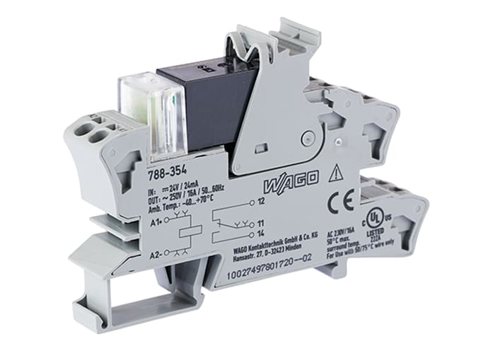 Modulo relè. Tensione nominale di ingresso: 24 V DC. 1 contatto in scambio. Limite corrente permanente: 16 A. per carichi di lampade. Indicatore di stato rosso. Larghezza modulo: 15 mm. 2,50 mm2. grigio