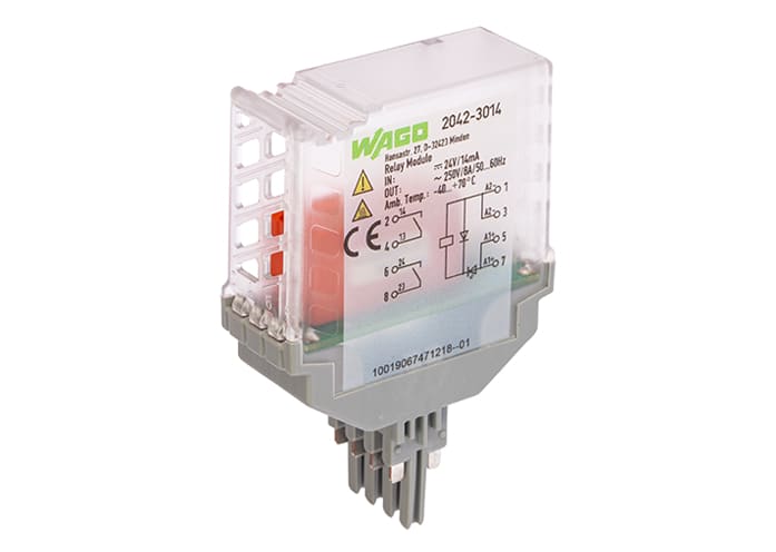 Modulo relè. Tensione nominale di ingresso: 24 V DC. 2 contatto NA. Limite corrente permanente: 8 A. Ferrovia. Indicatore di stato verde. Larghezza modulo: 20 mm
