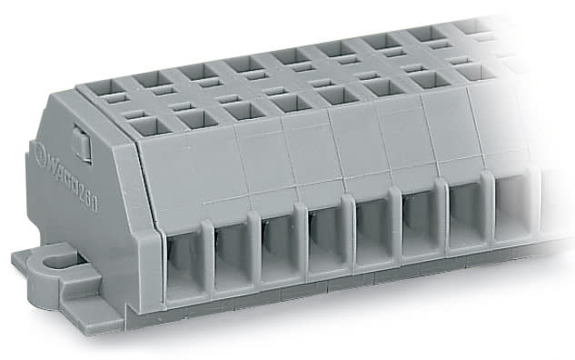 Morsettiera per 2 conduttori. senza pulsanti. con flange di fissaggio. 8 poli. per versioni di montaggio a vite o similari. Foro di fissaggio Ø 3,2 mm. 1,5 mm2. CAGE CLAMP®. 1,50 mm2. grigio