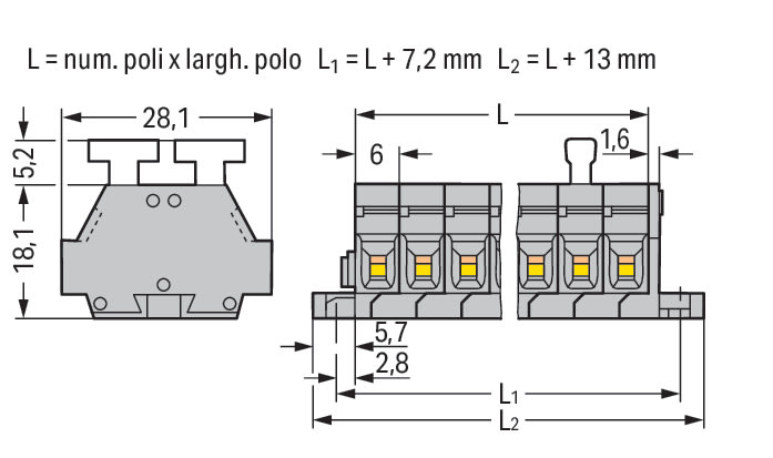 WAGO ELETTRONICA - Morsettiera per 2 conduttori.su entrambi i lati con pulsanti.con flange di fissaggio.grigio 261-430/341-000